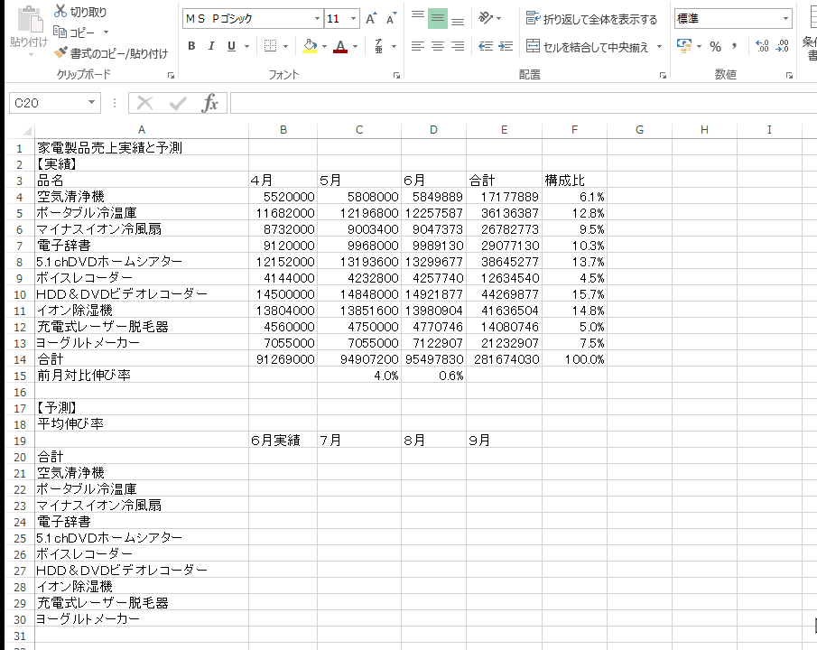 P21 ・セルA19「平均伸び率」は前月対比伸び率5月と6月を足して2で割る【セルA19=(C15+D15)/2】 ・セルC20「予測の合計」は6月の実績×(1+平均伸び率)。平均伸び率は絶対参照で固定する【セルC20=B20*(1+$A$19)】 ・セルC21「7月の空気清浄機」は7月の合計×売上実績空気清浄機の構成比。7月の合計は列だけ固定し、構成比は行だけ固定する【C$20*$F4】 クリックすると拡大表示します。