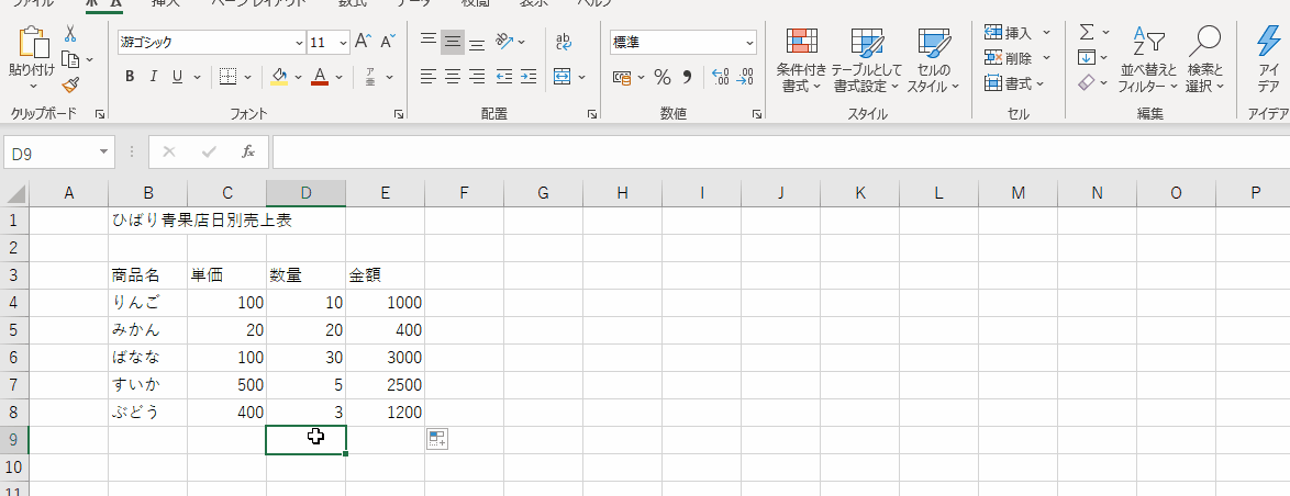 E3のセル=(イコール、中身)はC3セルの中身 × D3セルの中身 という意味です
