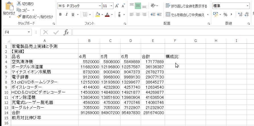 ・構成比セルF4は「=E4/$E$14」。E14は絶対参照で固定させたいので$マークを忘れずに。
