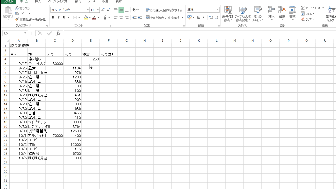 ・セルE5はIF関数で「””」ヌルを使用する。議論式【B5=””】真の場合【””】偽の場合【E4+C5-D5】