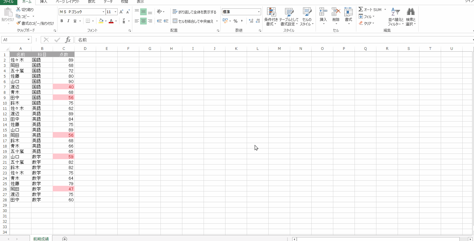・ピボットテーブルレポートの新規作成は、前期成績シートの元データーの何処かをクリック→挿入タブの中のピボットテーブル(左隅)をクリック→ピボットテーブル作成のテーブル範囲にすでに元データの範囲が設定されているので「OK」をクリック→あとは下記を参照↓↓↓