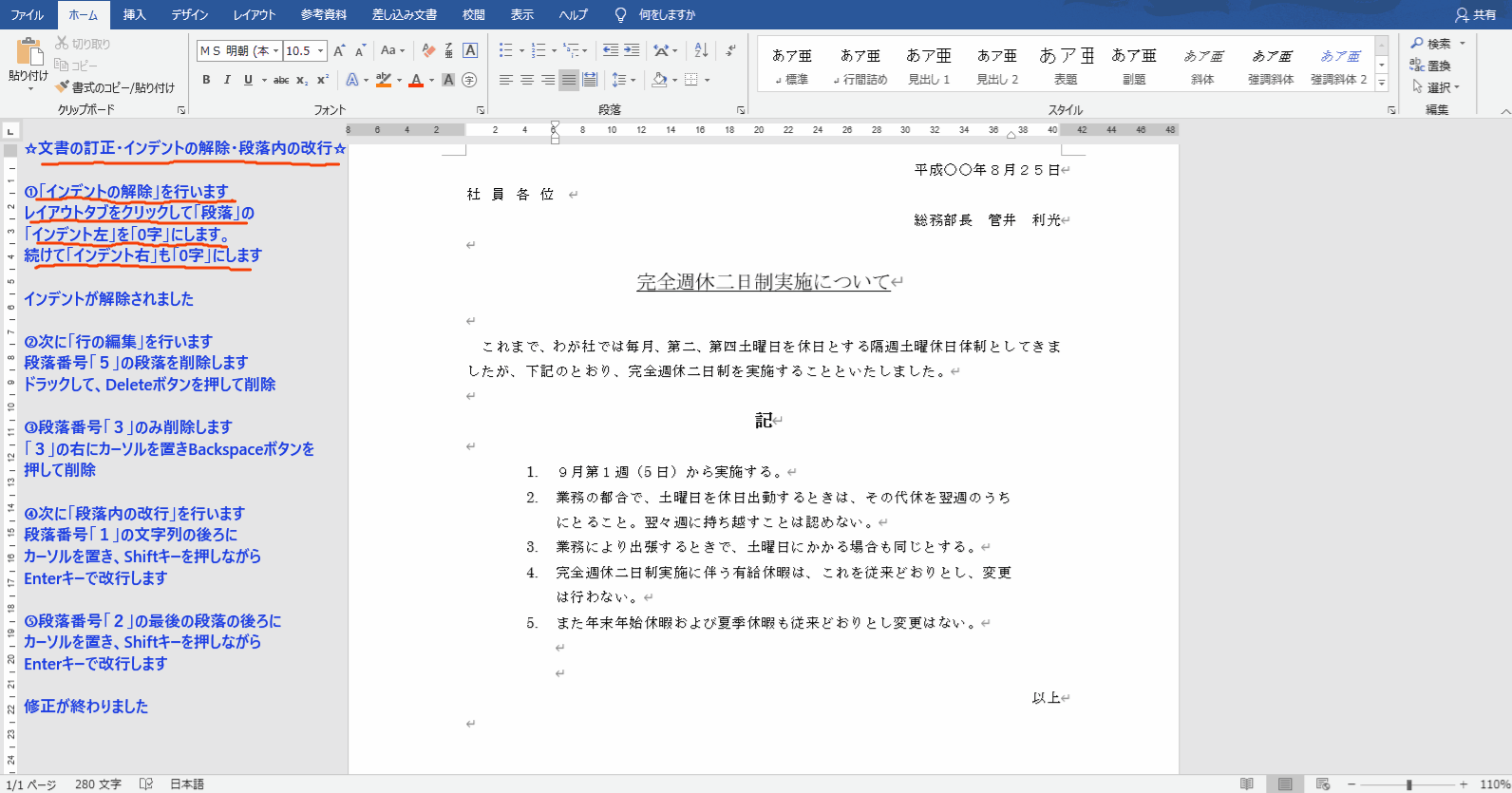 ☆文字の訂正・インデントの解除・段落内の改行☆