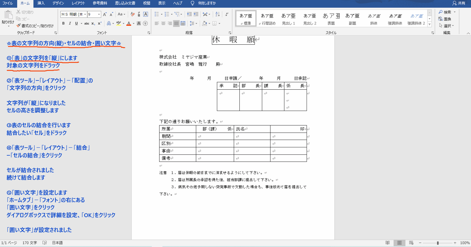 ☆表の文字列の方向(縦)・セルの結合・囲い文字☆