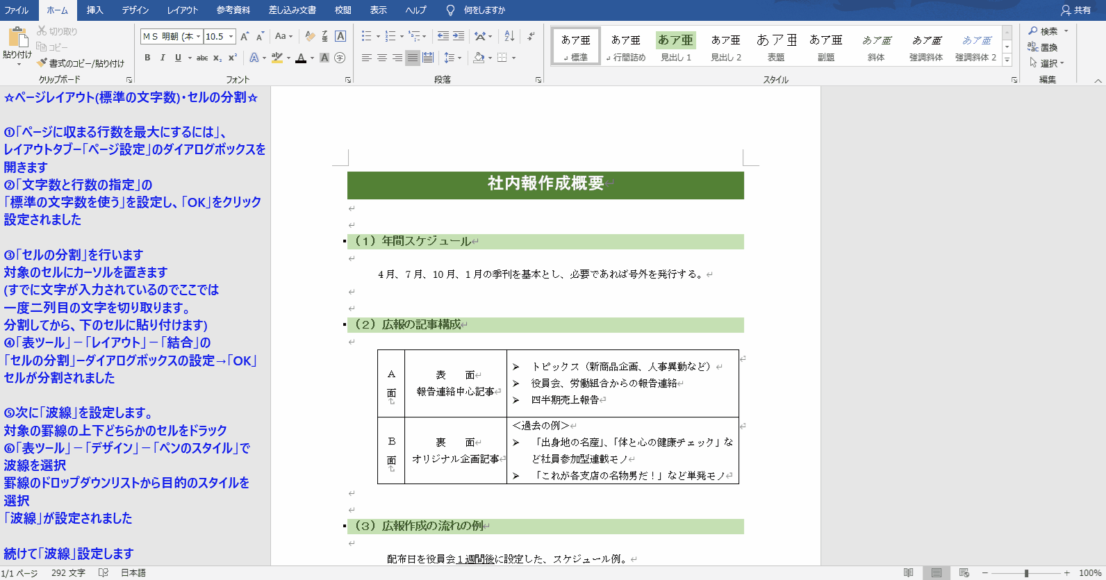 ☆ページレイアウト(標準の文字数)・セルの分割・罫線の設定(波線)・表内への画像挿入☆