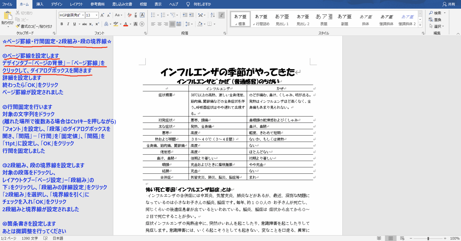 ☆ページ罫線・行間固定・2段組み・段の境界線☆